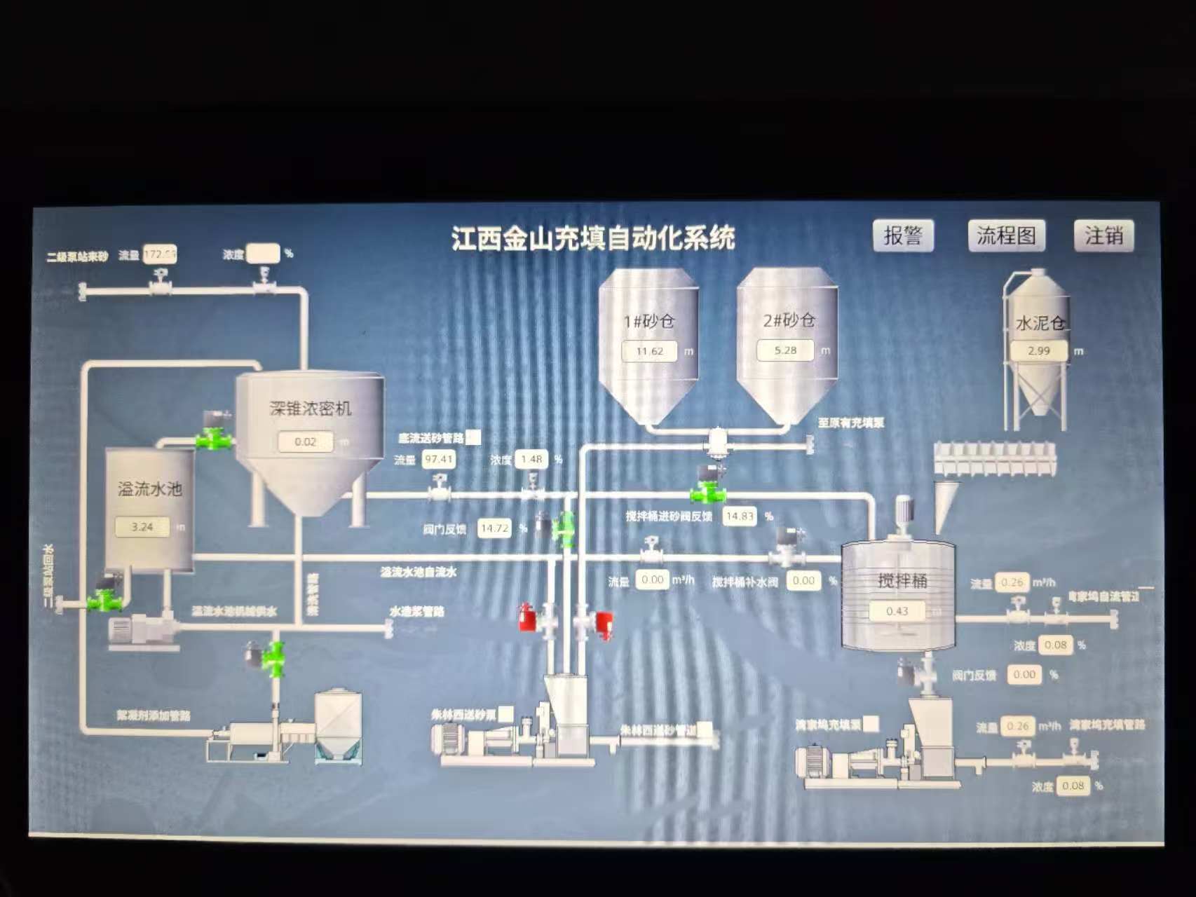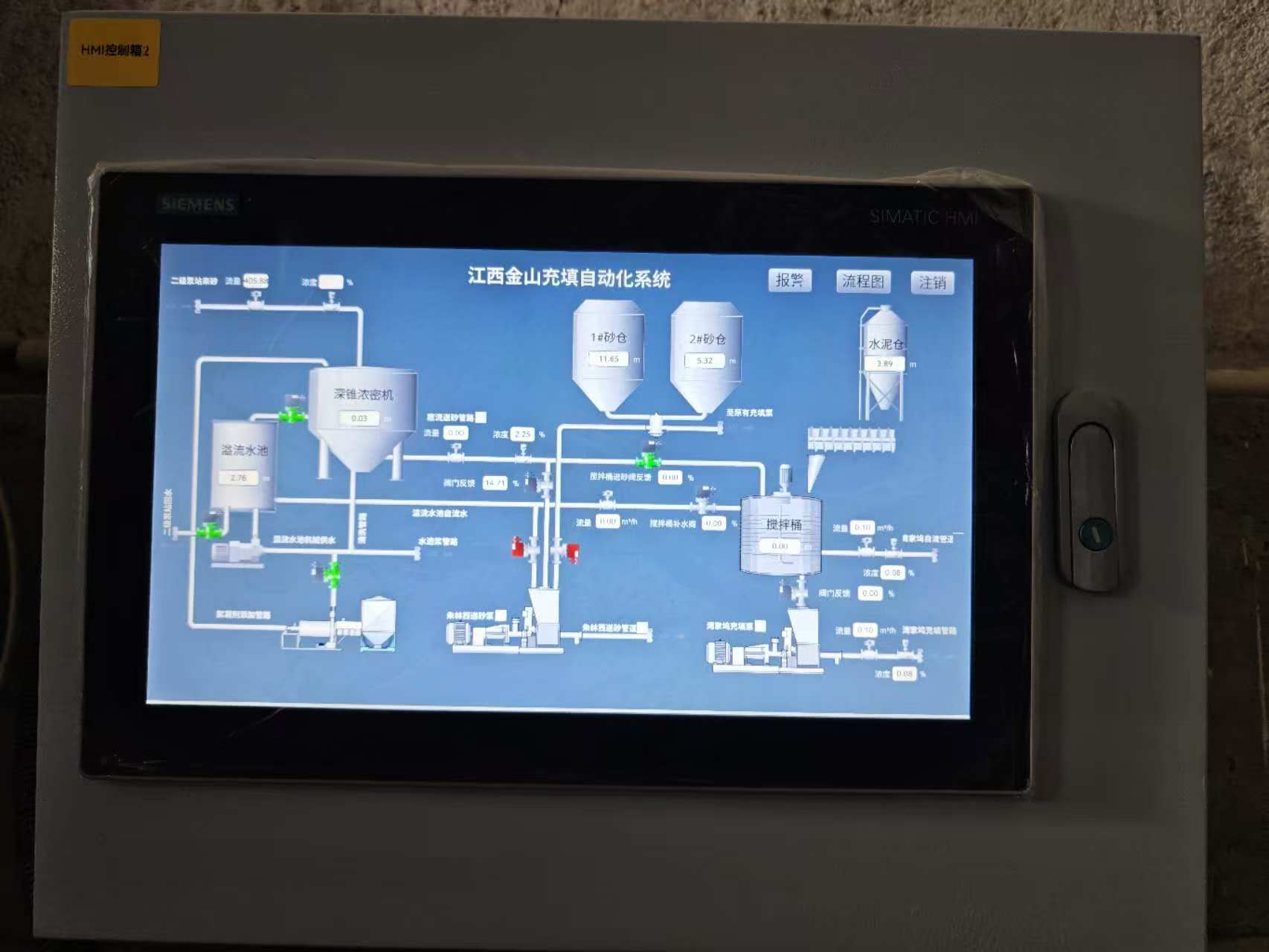 此次充填自动化项目由充填制备系统和两个充填站组成,全套自动化系统由我司设计并完成供货,采用西门子公司WINCC组态软件和S7-1500控制器搭配完成,控制飞翼厂家的浓密机系统、充填泵系统等,完成“一键充填”功能。