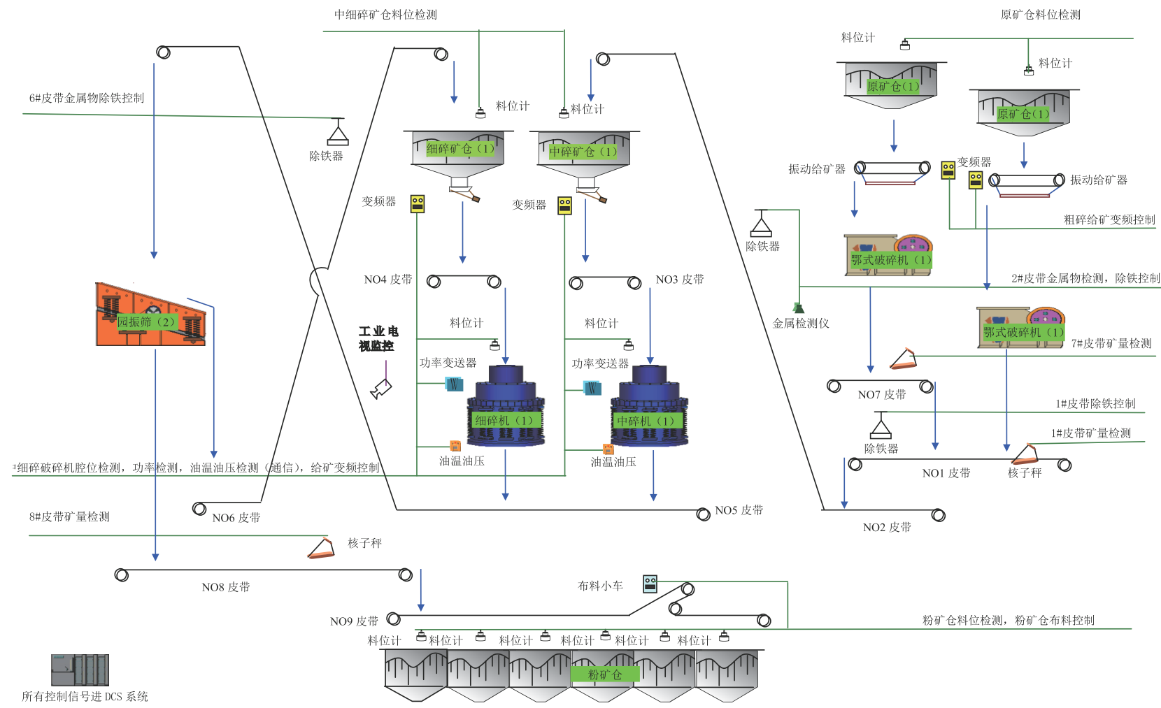 5、根据中间仓料位控制粗碎给矿机给矿量;中碎、细碎圆锥破碎机挤满给矿控制,根据破碎机进料口料位自动控制给矿量,实现挤满给矿,充分发挥设备潜能。